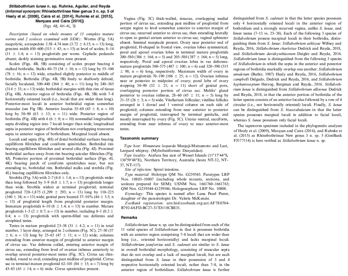 | Scientific Name Notes | ZooBank registration: urn:lsid:zoobank.org:act:AF7E0704- B792-4AFD-BC27-317D118CBE31; Informal synonym: Rhinebothriinae New genus 3 n. sp. 5 of Healy et al 2009, Caira et al 2014, Ruhnke et al 2015, Marques and Caira 2016 |