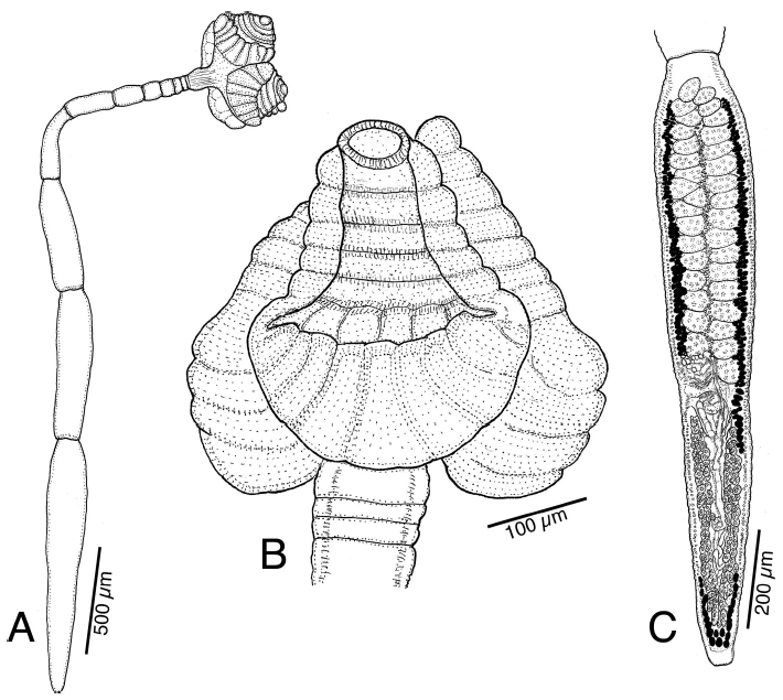 Figure 5. Line drawings of Stillabothrium lunae n. sp. (A) Whole worm of holotype (QM G239543). (B) Scolex of paratype (LRP 10803). (C)
