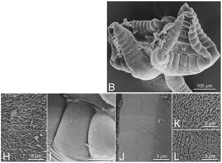 Figure 4. Scanning electron micrographs of Stillabothrium lunae (B; H–L). (B) Scolex of S. lunae n. sp.; small letters indicate location of details