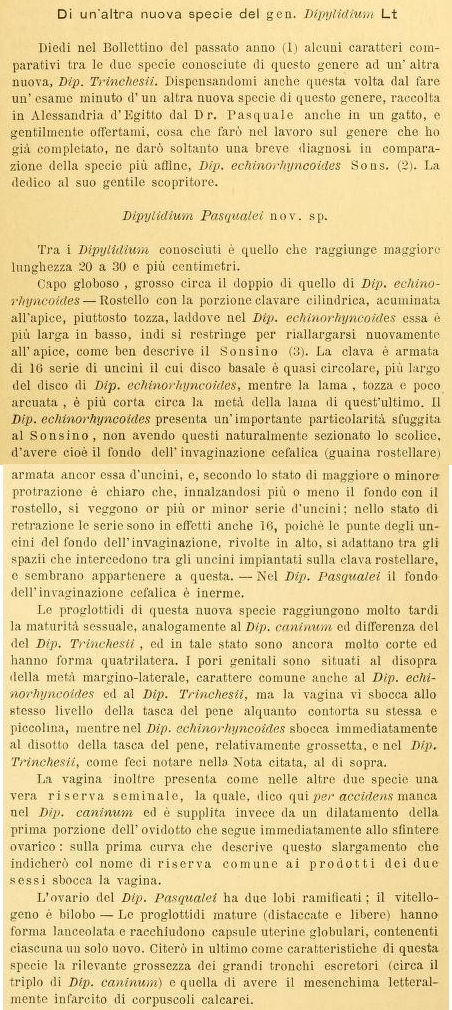 Diamare, V. 1893. Note su' Cestodi. Bollettino della Societa dei Naturalisti in Napoli 7(1&2): 9-13. (6876)Lopez-Neyra, C. R. 1927. Considérations sur le genre Dipylidium Leuckart. Bulletin de la Société de Pathologie Exotique 20: 434-440. (7454) |