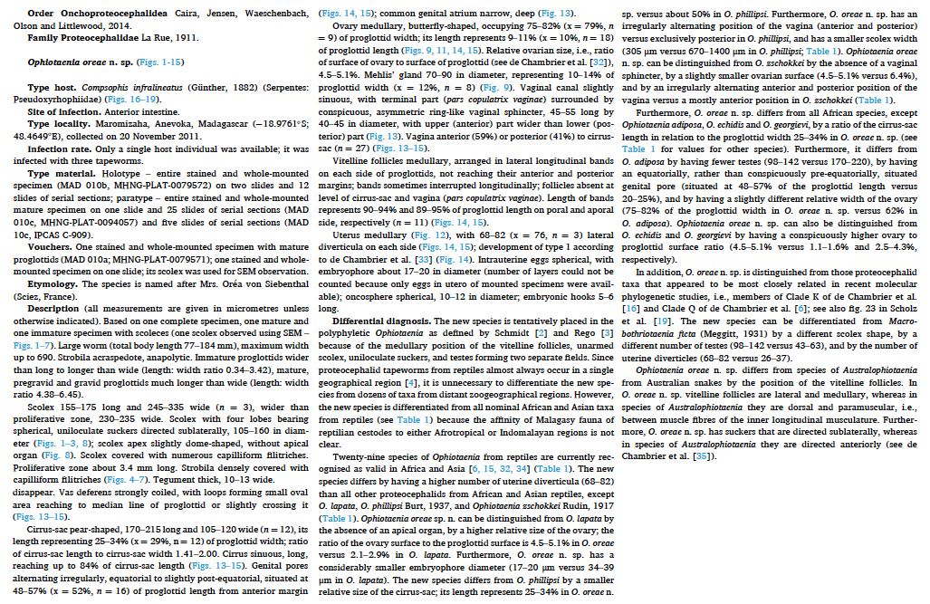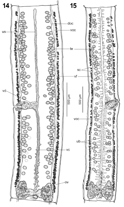 Figs. 14, 15. Line drawings of Ophiotaenia oreae n. sp., holotype, from Compsophis infralineatus, Madagascar (MHNG-PLAT-0079572). 14. Mature pregravid, dorsal view. 15. Gravid proglottid, ventral view... MoreFigs. 14, 15. Line drawings of Ophiotaenia oreae n. sp., holotype, from Compsophis infralineatus, Madagascar (MHNG-PLAT-0079572). 14. Mature pregravid, dorsal view. 15. Gravid proglottid, ventral view. |