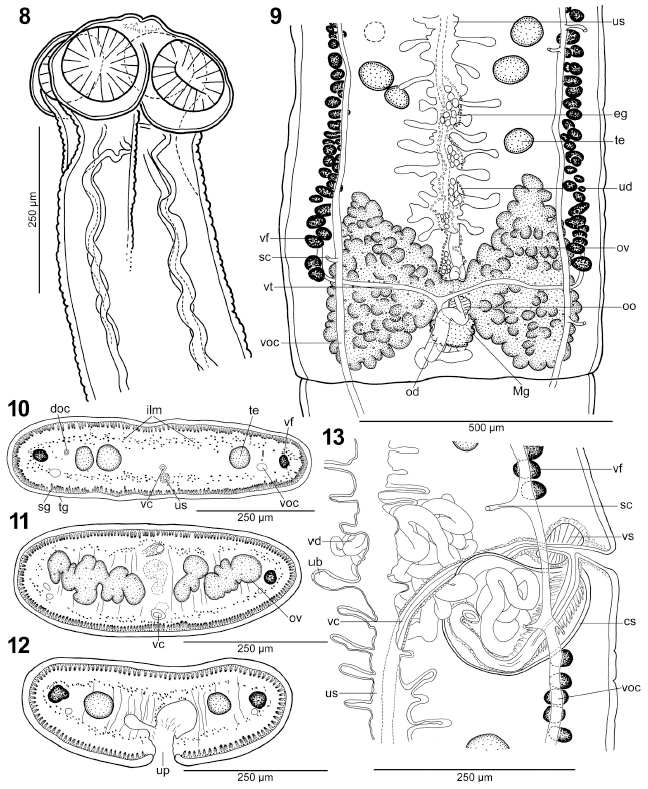 Figs. 8–13. Line drawings of Ophiotaenia oreae n. sp. from Compsophis infralineatus, Madagascar (holotype; MHNG-PLAT-0079572). 8. Scolex, frontal view. 9. Detail of posterior part of pregravid proglot... MoreFigs. 8–13. Line drawings of Ophiotaenia oreae n. sp. from Compsophis infralineatus, Madagascar (holotype; MHNG-PLAT-0079572). 8. Scolex, frontal view. 9. Detail of posterior part of pregravid proglottid. 10. Cross section at level of posterior part of mature proglottid. 11. Cross section at level of ovary. 12. Cross section of anterior part of gravid proglottid. 13. Terminal genitalia with cirrus-sac and vagina; gravid proglottid. Abbreviations (Figs. 8–15): cs—cirrus-sac; doc—dorsal osmoregulatory canals; eg—eggs; ilm—inner longitudinal muscles; Mg—Mehlis’ gland; od—oviduct; oo—oocapt; ov—ovary; sc—secondary canals;