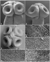 Figs. 1–7. Scanning electronic micrographs of Ophiotaenia oreae n. sp. from Compsophis infralineatus, Madagascar (MHNG-PLAT-0079571). 1. Scolex, frontal view. 2. Scolex, lateral view. 3. Scolex, apica... MoreFigs. 1–7. Scanning electronic micrographs of Ophiotaenia oreae n. sp. from Compsophis infralineatus, Madagascar (MHNG-PLAT-0079571). 1. Scolex, frontal view. 2. Scolex, lateral view. 3. Scolex, apical view. 4–7. Microtriches on the apex of the scolex, external (non-adherent) surface of suckers, luminal surface of suckers and their upper rim, respectively. |