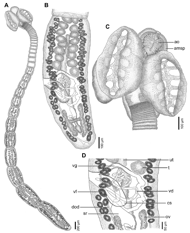 Fig. 2. Line drawings of Echeneibothrium cristinae sp. nov. from Bathyraja cousseauae. (A) Whole mature worm (holotype MACN-Pa No. 734). (B) Terminal mature proglottid (paratype MACN-Pa No. 736/4). (C) Scolex (holotype MACN-Pa No. 734). (D) Detail of terminal genitalia in a terminal mature proglottid (paratype MACNPa No. 736/4). Abbreviations: amsp, apical modification of scolex proper; ao, apical organ; cs, cirrus sac; dod, dorsal osmorregulatory duct; ov, ovary; sr, seminal receptacle; t, testes; ut, uterus; vd, vas deferens; vf, vitelline follicle; vg, vagina.