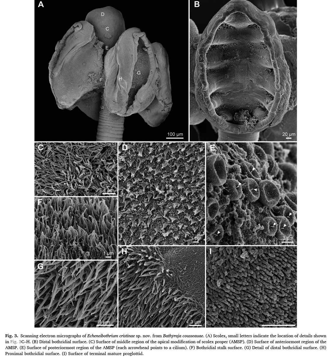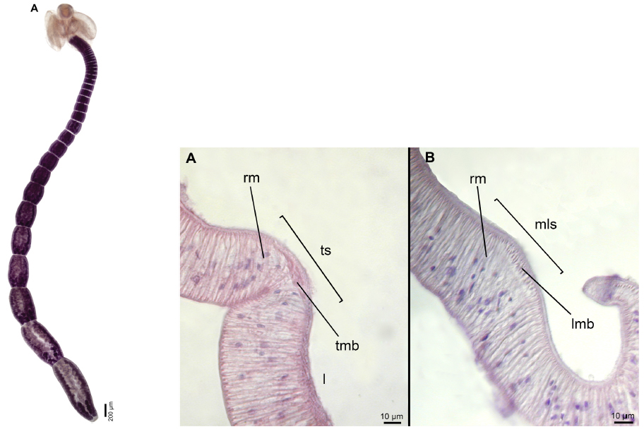 Fig. 1. [left] Light micrographs of whole mature worms of Echeneibothrium spp. from the Argentine Sea. (A) Echeneibothrium cristinae sp. nov. from Bathyraja cousseauae