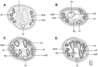 Abbreviations: cs, cirrus sac; dod, dorsal osmorregulatory duct; ov, ovary; sr, seminal receptacle; t, testes; ut, uterus; vd, vas deferens; vf, vitelline follicle; vg, vagina; vod, ventral osmoregulatory duct.
