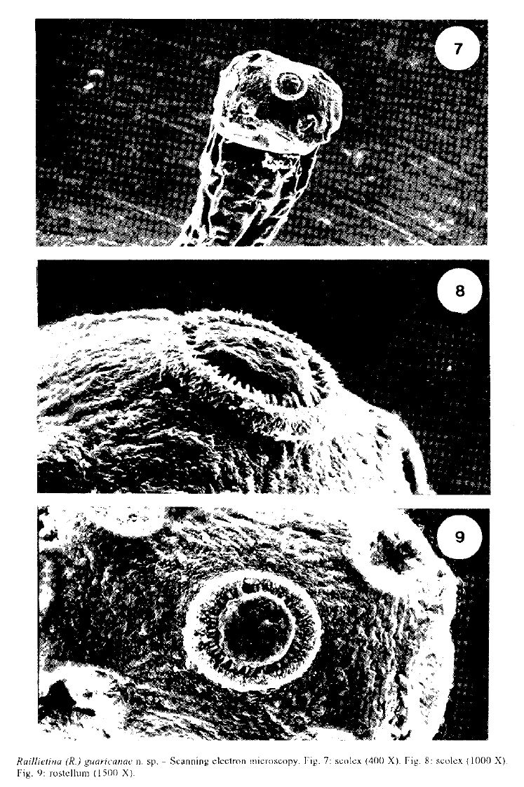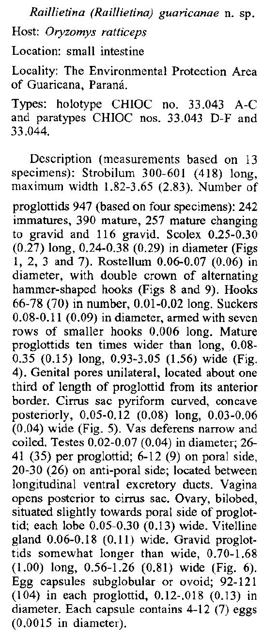Pereira César, T. C. and E. Luz. 1993. Raillietina (Raillietina) guaricana n. sp. (Cestoda-Davaineidae), parasite of wild rats from the environmental protection area of Guaricana, Paraná, Brazil. Mem. Inst. Oswaldo Cruz 88: 85-88. (7470) |