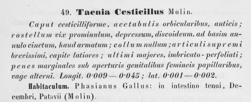 | Synonyms | Taenia cesticillus Molin, 1858; Davainea cesticillus Blanchard, 1891; Brumptiella cesticillus (Molin, 1858) Lopez-Neyra, 1931; Taenia infundibuliformis Dujardin, 1845 after Goeze, 1782; R. (R.) mutabilis Ruther, 1901 |