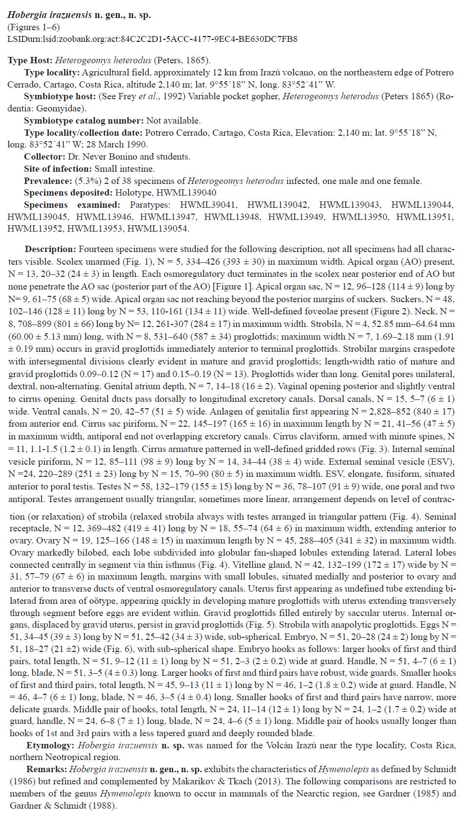 Gardner, S. L., A. T. Dursahinhan, M. L. Campbell, and S. E. Racz. 2020. A new genus and two new species of unarmed hymenolepidid cestodes (Cestoda: Hymenolepididae) from geomyid rodents in Mexico and Costa Rica. Zootaxa 4766: 358-376. (7485) |