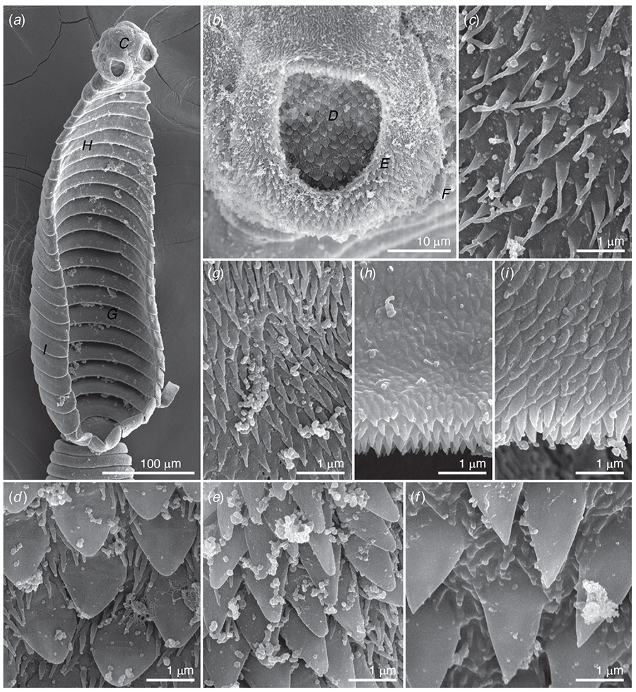 Fig. 12. Scanning electron micrographs of Amiculucestus calli, sp. nov. (a) Scolex and anterior region of strobila comprising barren, laterally expanded proglottids forming trough; uppercase italic letters indicate locations of details shown in (c) and (g–i). (b) Acetabulum; uppercase italic letters indicate locations of details shown in (d–f). (c) Surface of scolex proper anterior to acetabula. (d) Distal acetabular surface. (e) Surface of acetabular rim. (f) Surface of scolex proper posterior to acetabula. (g) Concave surface of trough, anterior proglottid region. (h) Concave surface of trough, posterior proglottid region. (i) Convex surface of trough. (j) Surface of reproductive proglottid away from margin.
