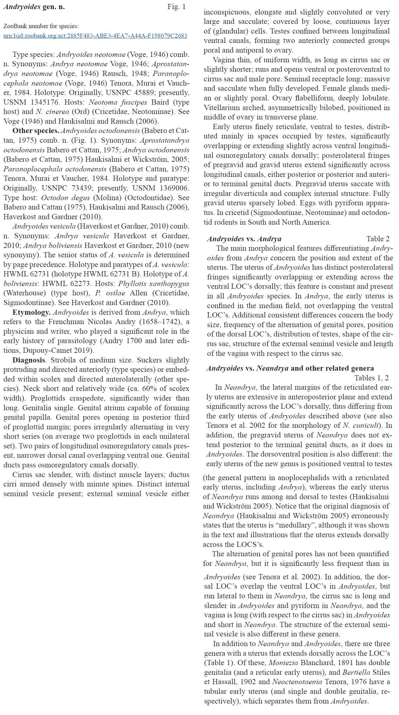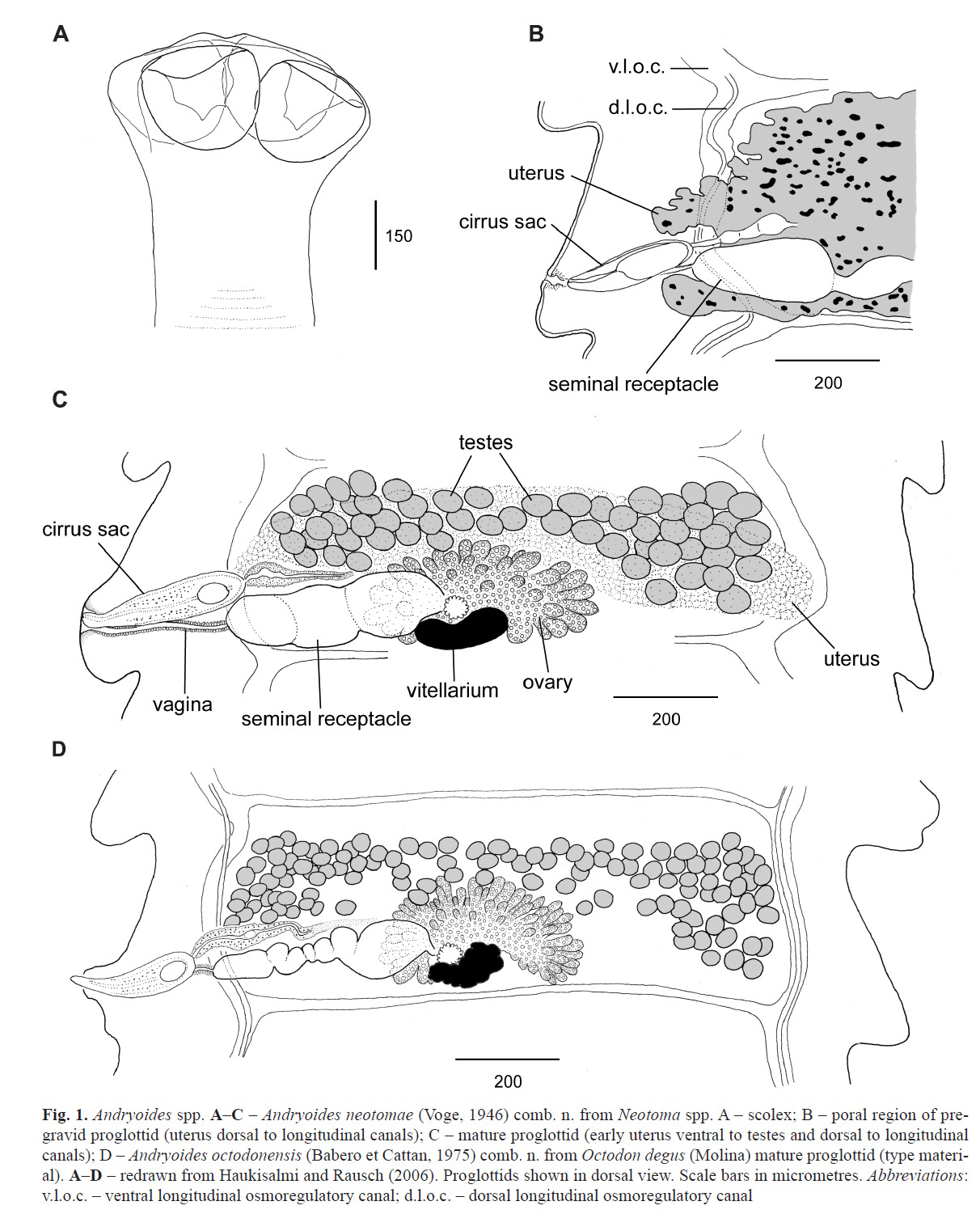 Haukisalmi, V. 2023. Andryoides gen. n. and morphological key features in cestodes of the family Anoplocephalidae sensu stricto (Cyclophyllidea) in mammals. Folia Parasitologica 70: 006. (7497) |