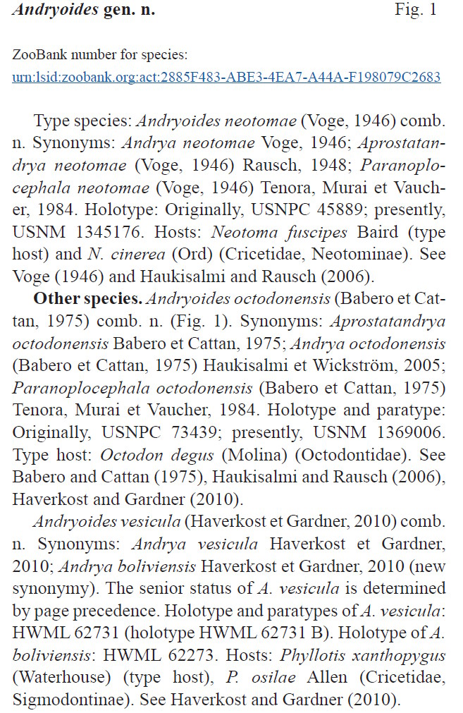 Haverkost, T. R. and S. L. Gardner. 2010. Two new species of Andrya (Cestoda: Anoplocephalidae) from sigmodontine rodents in the Neotropics. Comparative Parasitology 77: 145-153. (4738) Download PDFHaukisalmi, V. 2023. Andryoides gen. n. and morphological key features in cestodes of the family Anoplocephalidae sensu stricto (Cyclophyllidea) in mammals. Folia Parasitologica 70: 006. (7497) |