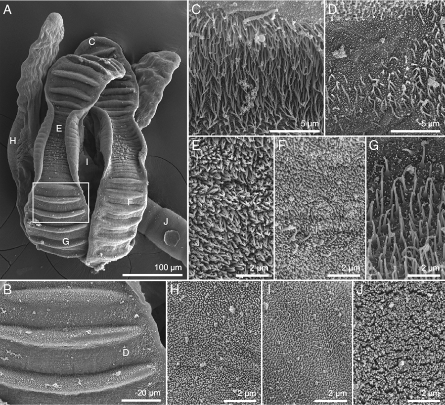 (G) Distal bothridial surface of septum in posterior region. (H) Proximal bothridial surface. (I) Surface of stalk. (J) Surface of strobila.