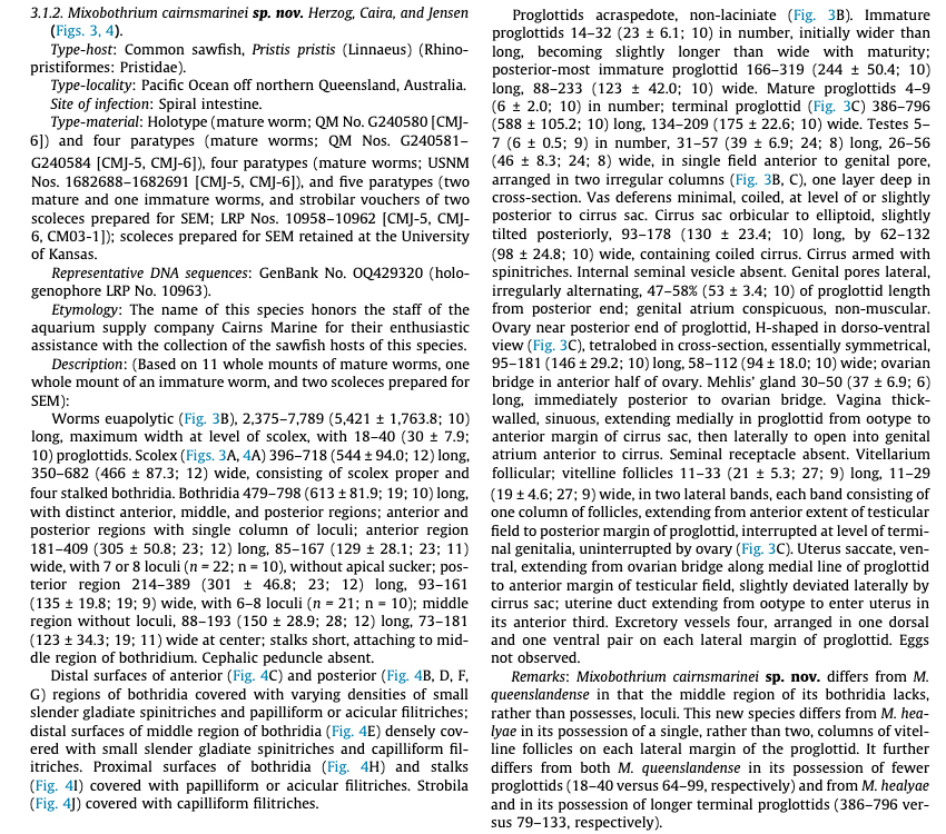 | Type Material | Holotype (mature worm; QM No. G240580 [CMJ- 6]) and four paratypes (mature worms; QM Nos. G240581–G240584 [CMJ-5, CMJ-6]), four paratypes (mature worms; USNM Nos. 1682688–1682691 [CMJ-5, CMJ-6]), and five paratypes (two mature and one immature worms, and strobilar vouchers of two scoleces prepared for SEM; LRP Nos. 10958–10962 [CMJ-5, CMJ- 6, CM03-1]); scoleces prepared for SEM retained at the University of Kansas |