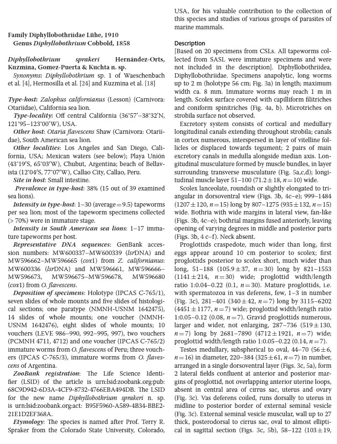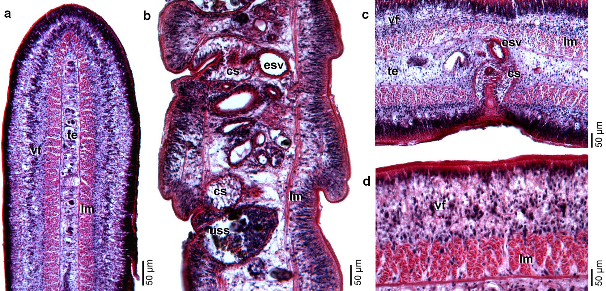 Photomicrographs of histological sections of holotype of ‘Diphyllobothrium’ sprakeri n. sp. from Zalophus californianus, California, USA. a Gravid proglottid, cross section. b Gravid proglottids, sagi... MorePhotomicrographs of histological sections of holotype of ‘Diphyllobothrium’ sprakeri n. sp. from Zalophus californianus, California, USA. a Gravid proglottid, cross section. b Gravid proglottids, sagittal section. c Detail of cirrus sac and genital atrium in gravid proglottid, cross section. d Detail of longitudinal musculature. Abbreviations: cs, cirrus sac; esv, external seminal vesicle; lm, longitudinal musculature; te, testes; uss, uterine sac-like structure; vf, vitelline follicle. |