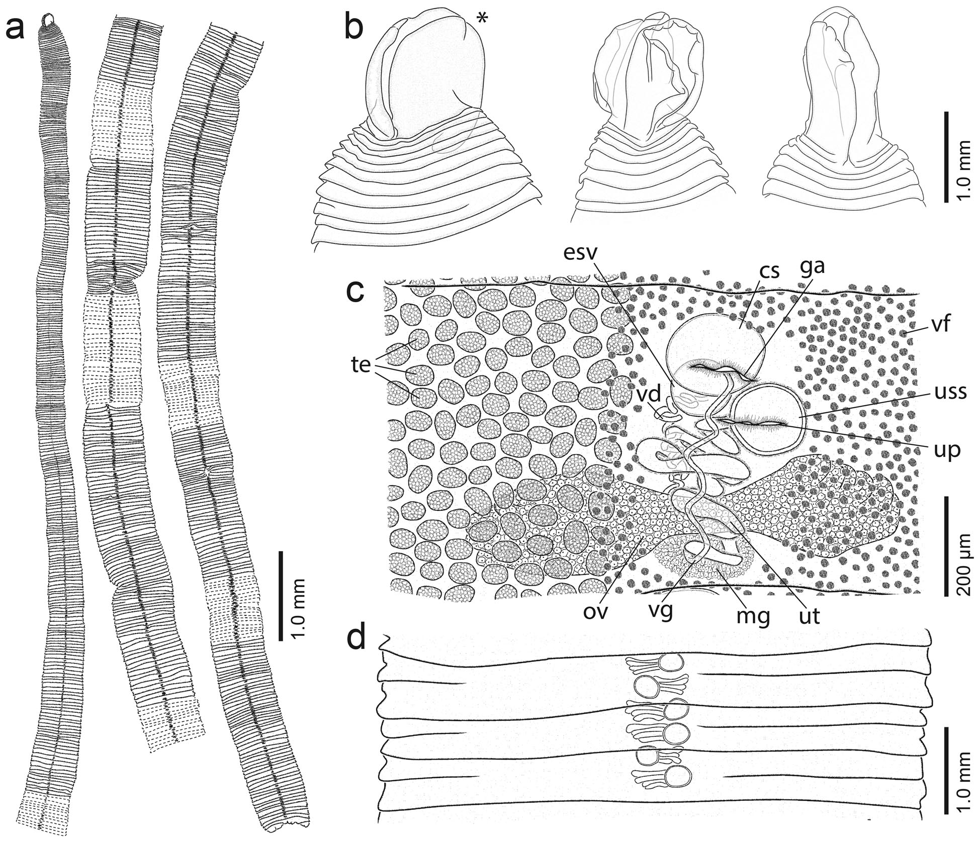 Line drawings of ‘Diphyllobothrium’ sprakeri n. sp. from Zalophus californianus, California, USA. a Selected anterior, middle and posterior proglottids of holotype, ventral view. b Scoleces, dorsovent... MoreLine drawings of ‘Diphyllobothrium’ sprakeri n. sp. from Zalophus californianus, California, USA. a Selected anterior, middle and posterior proglottids of holotype, ventral view. b Scoleces, dorsoventral view. Scolex of holotype marked with an asterisk. c Genitalia of mature proglottids of holotype, ventral view, vitelline follicles omitted on left side and testes on the right side of proglottid. d Schematic drawing of gravid proglottids of holotype showing the position of the sac-like structure of the uterus. Abbreviations: cs, cirrus sac; esv, external seminal vesicle; ga, genital atrium; mg, Mehlis’ gland; ov, ovary; te, testes; up, uterine pore; uss, uterine sac-like structure; ut, uterus; vf, vitelline follicle; vg, vagina. |