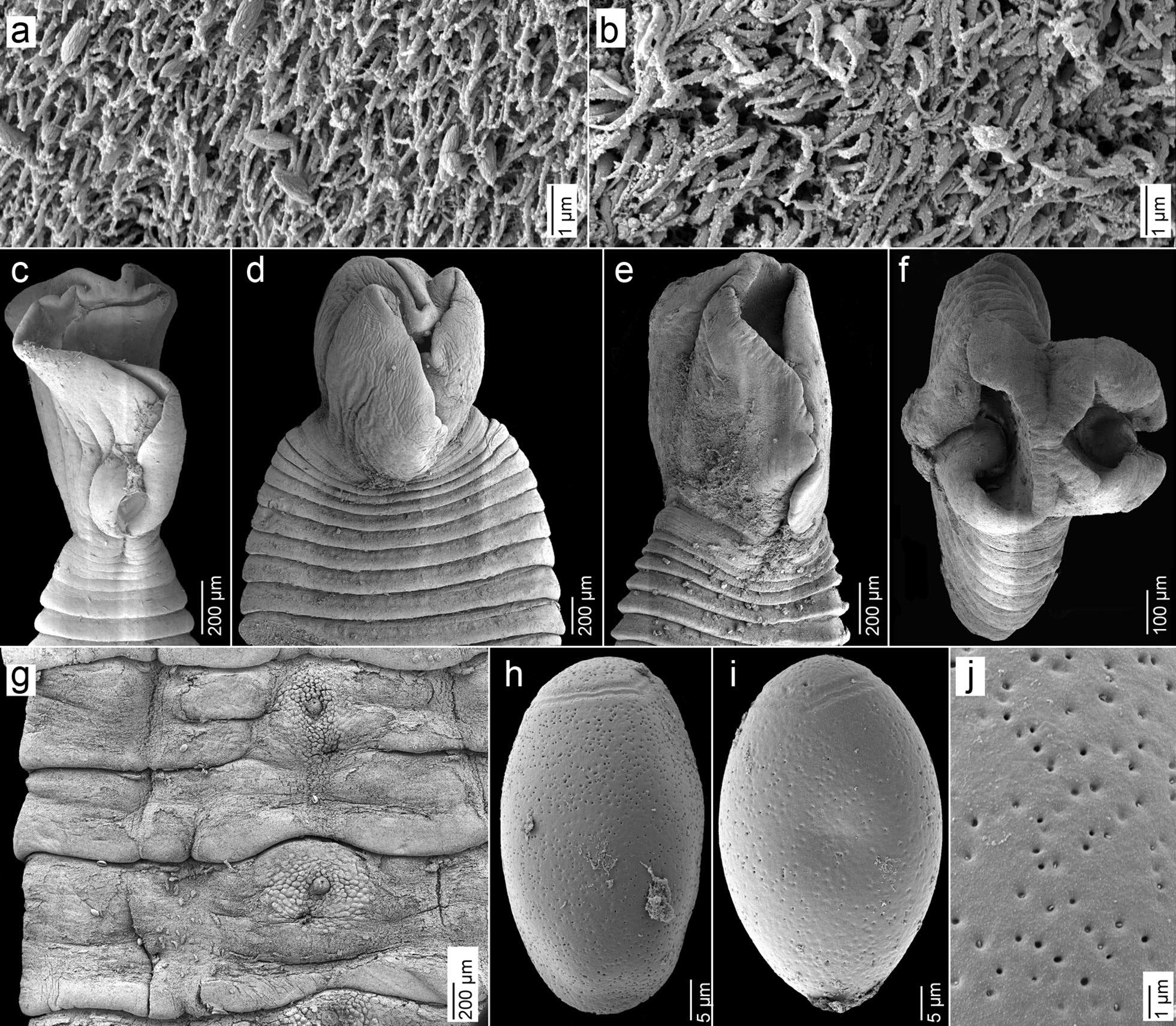 Scanning electron micrographs of ‘Diphyllobothrium’ sprakeri n. sp. from Zalophus californianus, California, USA. a Capilliform filitriches on the lateral scolex surface. b Coniform spinitriches on th... MoreScanning electron micrographs of ‘Diphyllobothrium’ sprakeri n. sp. from Zalophus californianus, California, USA. a Capilliform filitriches on the lateral scolex surface. b Coniform spinitriches on the dorsoventral scolex surface. c–e Scoleces, dorsoventral view. f Scolex in apical view. g Ventral surface of gravid proglottids showing numerous papillae surrounding the genital atrium. h–i Eggs and surface of egg shell. j Detail of egg surface.