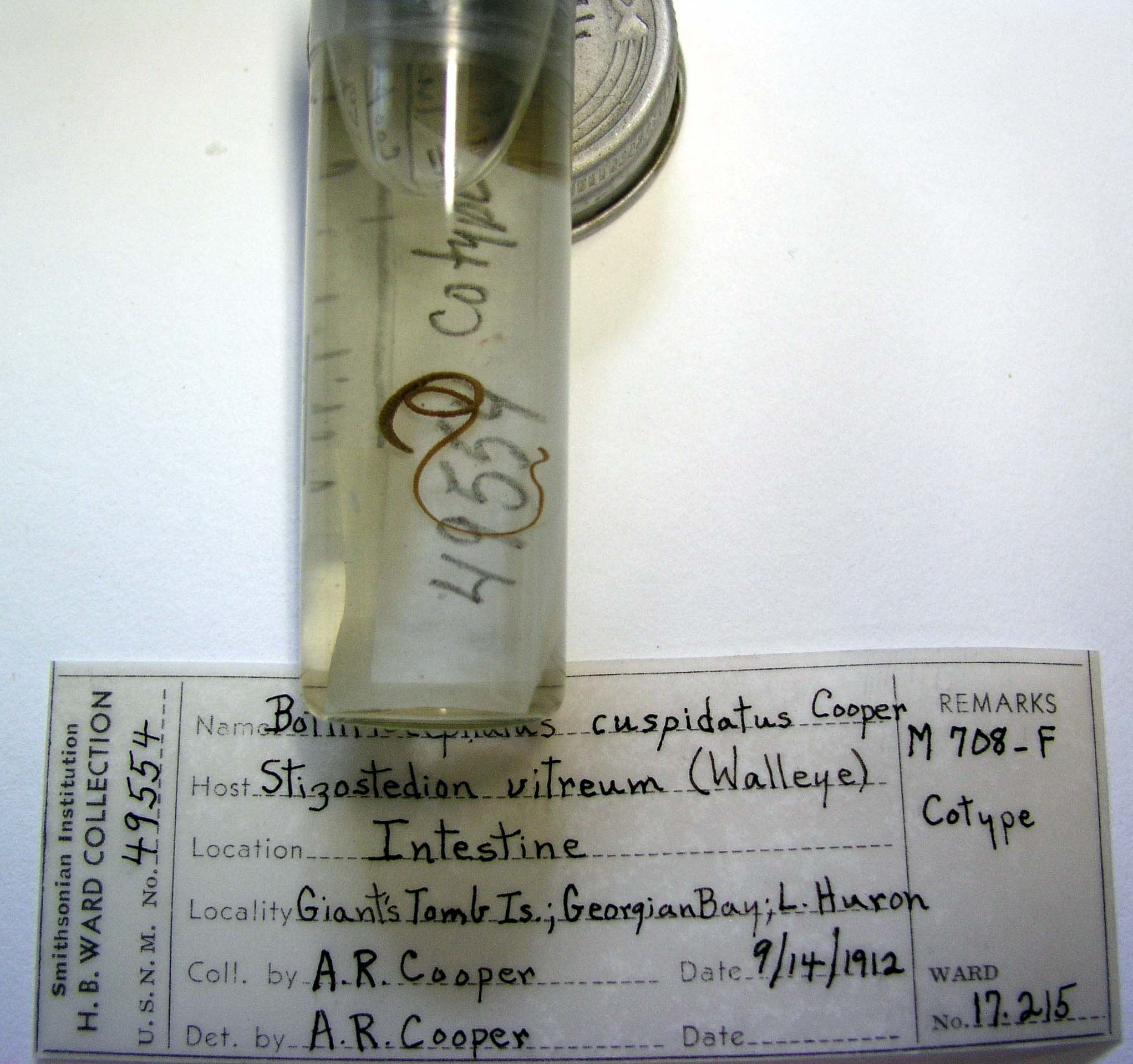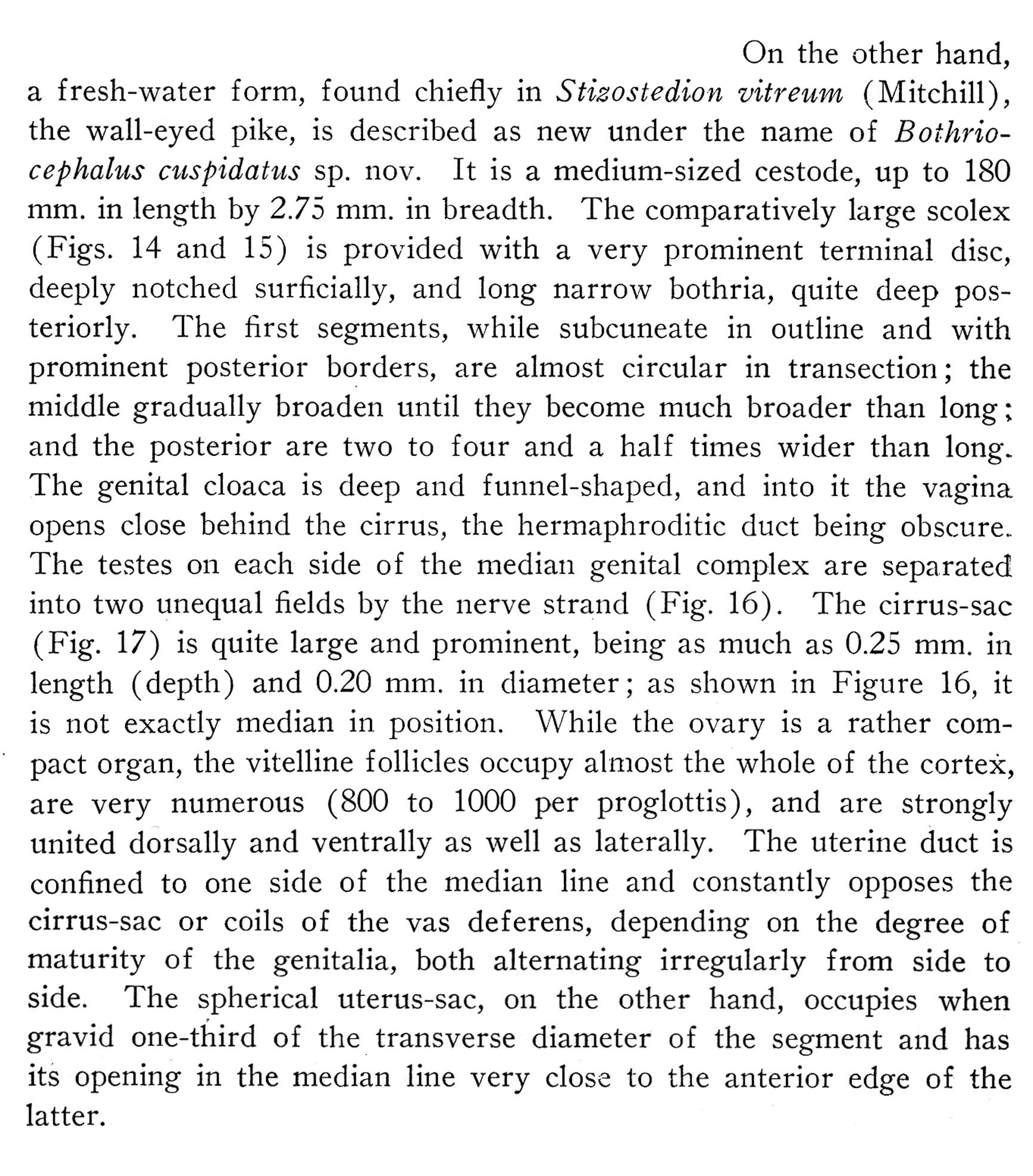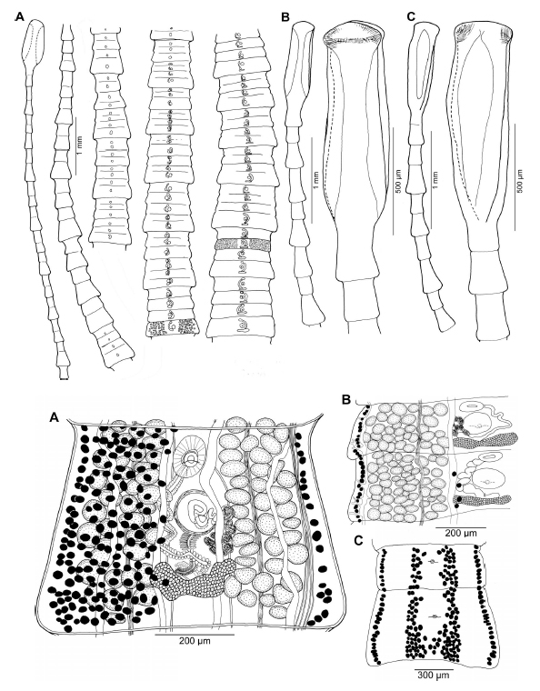 Figure 1. Bothriocestus cuspidatus (Cooper, 1917) n. comb. from Sander vitreus (Mitchill, 1818). (A) Anterior and middle part of strobila, Fox River, Wisconsin, USA; note craspedote, trapezoidal progl... MoreFigure 1. Bothriocestus cuspidatus (Cooper, 1917) n. comb. from Sander vitreus (Mitchill, 1818). (A) Anterior and middle part of strobila, Fox River, Wisconsin, USA; note craspedote, trapezoidal proglottids, with primary, secondary, and tertiary proglottids differing from each other in size. (B) Anterior end of body and scolex, lateral view. (C) Anterior end of body and scolex, dorsoventral view, Lake Winnipeg, Manitoba, Canada.