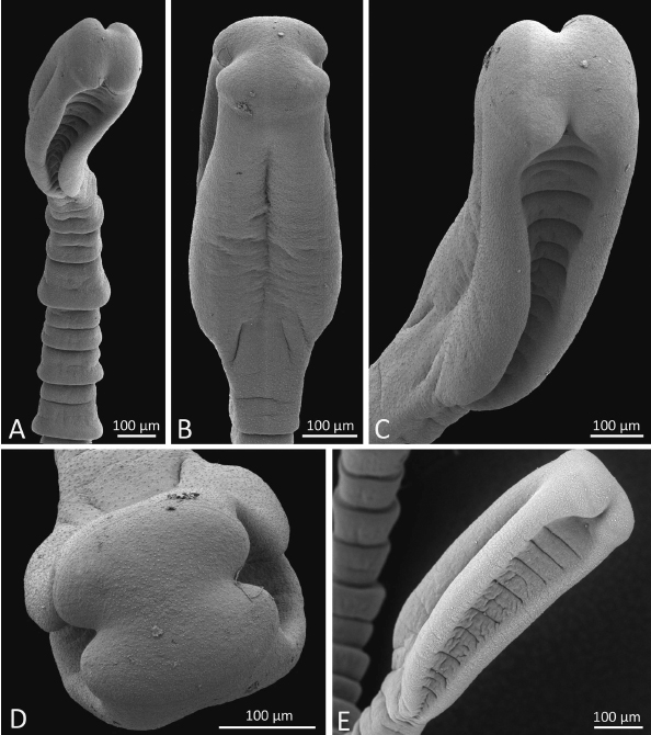Figure 2. Scanning electron micrographs of Bothriocestus cuspidatus (Cooper, 1917) n. comb. from Sander vitreus (Mitchill, 1818), Lake Winnipeg, Manitoba, Canada (A–D), and Wolf River, Wisconsin, USA ... MoreFigure 2. Scanning electron micrographs of Bothriocestus cuspidatus (Cooper, 1917) n. comb. from Sander vitreus (Mitchill, 1818), Lake Winnipeg, Manitoba, Canada (A–D), and Wolf River, Wisconsin, USA (E). (A) Anterior part, frontal view; note markedly trapeziform proglottids of different sizes. (B) Scolex, lateral view. (C) Scolex, subapical, frontal view. (D) Scolex, apical view; note apical disc. (E) Scolex, frontal view. |