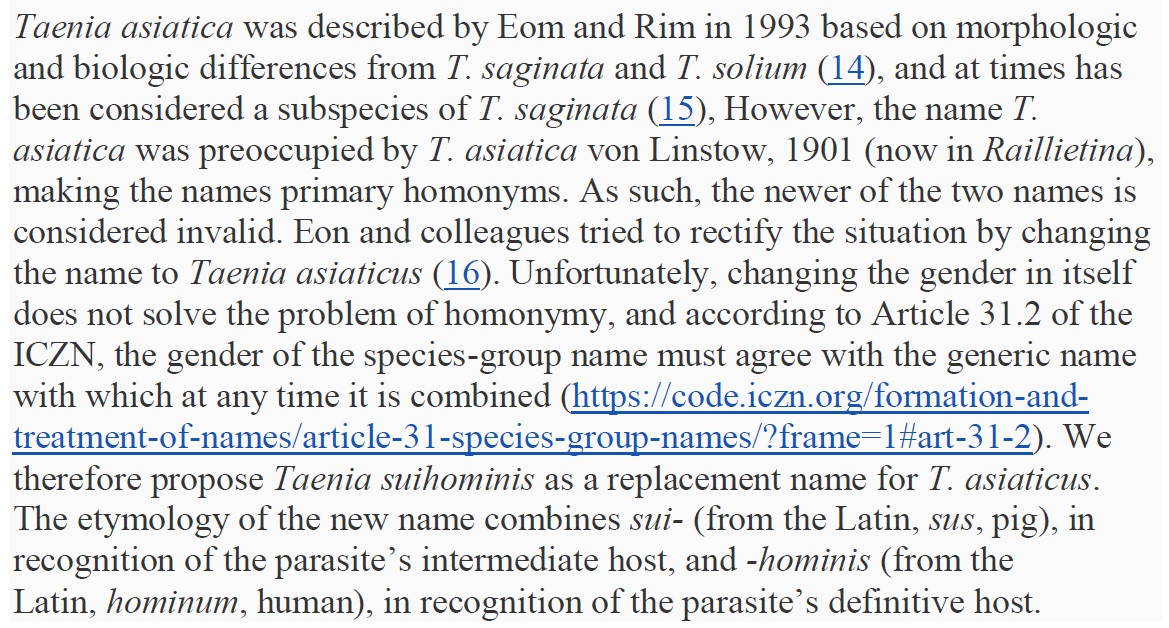 | Synonyms | Taenia asiatica Eom & Rim, 1993, Taenia saginata asiatica Eom & Rim, 1993, Taenia asiaticus Eom et al., 2020 |