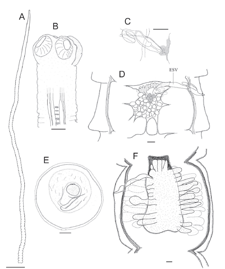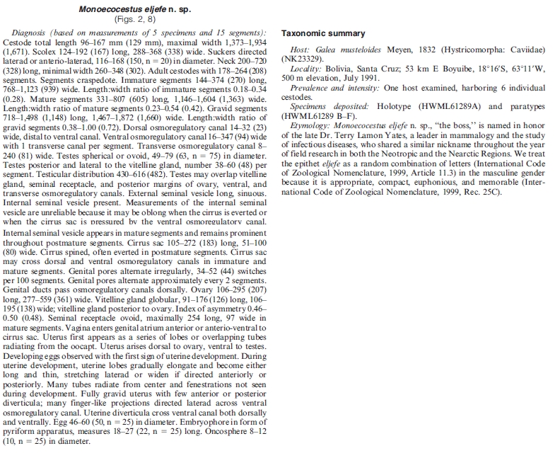 Haverkost, T. R. and Gardner, S. L. 2010. New species in the genus Monoecocestus (Cestoda: Anoplocephalidae) from Neotropical rodents (Caviidae and Sigmodontinae). Journal of Parasitology 96: 580-595. (4752) Download PDFHaukisalmi, V. 2023. Systematic position of the enigmatic Quentinia mesovitellinica (Ręgo, 1967) (Cestoda, Cyclophyllidea). Helmimnthologia 60: 246-252. (7542) |