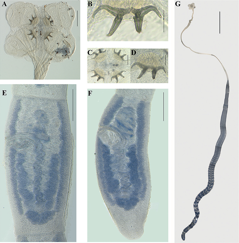 Figure 2. Acanthobothrium pulidofloresae sp. nov. A–D, G holotype (CNHE–11880) E, F paratype (CHE-P00145) A scolex B pair of hooks C apical suckers with pads muscular D apical sucker E mature proglottid F terminal mature proglottid G complete tapeworm. Scale bars: 50 μm (B, D); 100 μm (C); 200 μm (A, E, F); 3 mm (G).