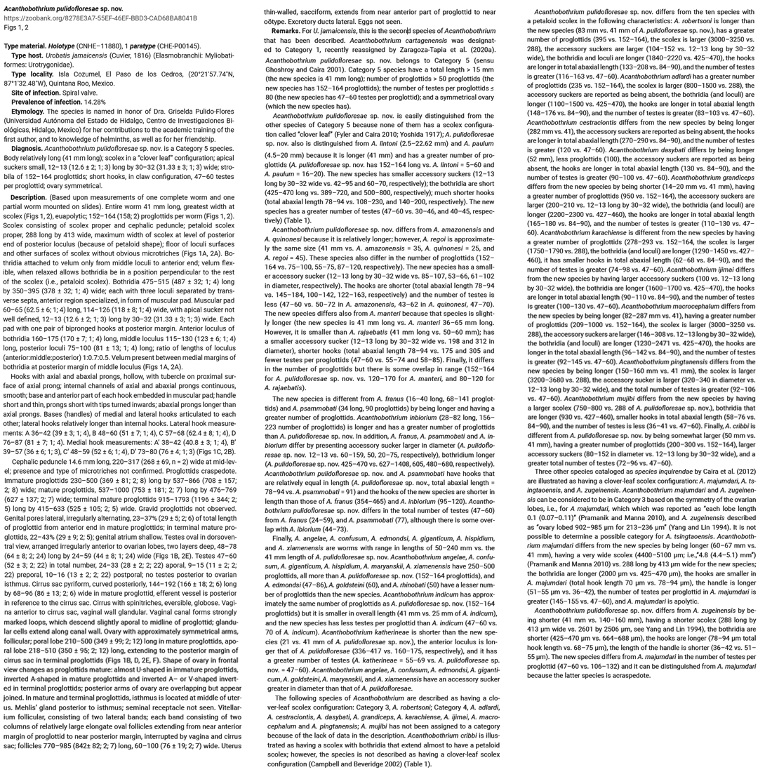 Rodriguez-Ibarra, E., J. Violante-Gonzalez, and S. Monks. 2023. Two new species of Acanthobothrium Blanchard, 1848 (Cestoda, Onchoproteocephalidea) from Urobatis jamaicensis (Cuvier, 1816) (Elasmobranchii, Batoidea, Myliobatiformes) of the Mexican Caribbean. ZooKeys 1169: 175—201. (7545) Download PDF |