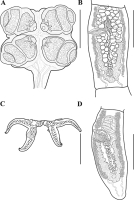 Figure 1. Acanthobothrium pulidofloresae sp. nov. A, C, D holotype (CNHE–11880) B paratype (CHE-P00145) A scolex B mature proglottid C pair of hooks D terminal mature proglottid. Scale bars: 75 μm (C); 400 μm (B, D); 500 μm (A).
