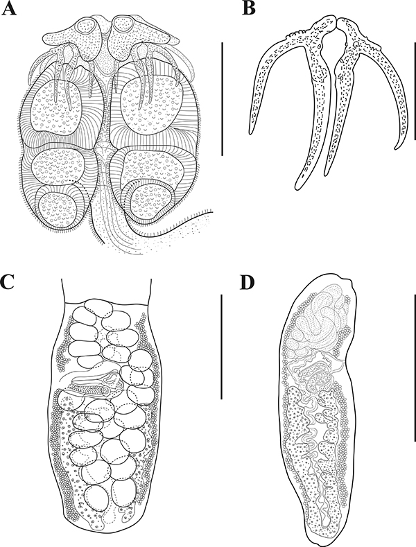 Figure 3. Acanthobothrium garciaprietoi sp. nov. holotype (CNHE–11881). A scolex B pair of hooks C mature proglottid D terminal mature proglottid. Scale bars: 70 μm (B); 200 μm (A, C); 400 μm (D).