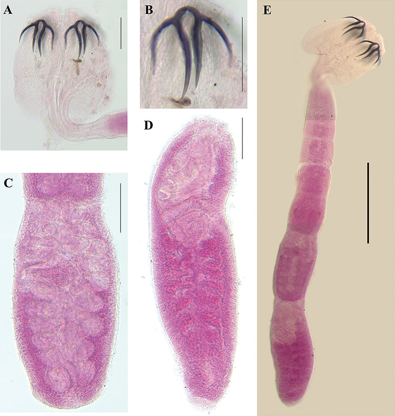 Figure 4. Acanthobothrium garciaprietoi sp. nov. A–D holotype (CNHE–11881) E paratype (CNHE–11882) A scolex B pair of hooks C mature proglottid D terminal mature proglottid E complete tapeworm, 400 μm. Scale bars: 100 μm.
