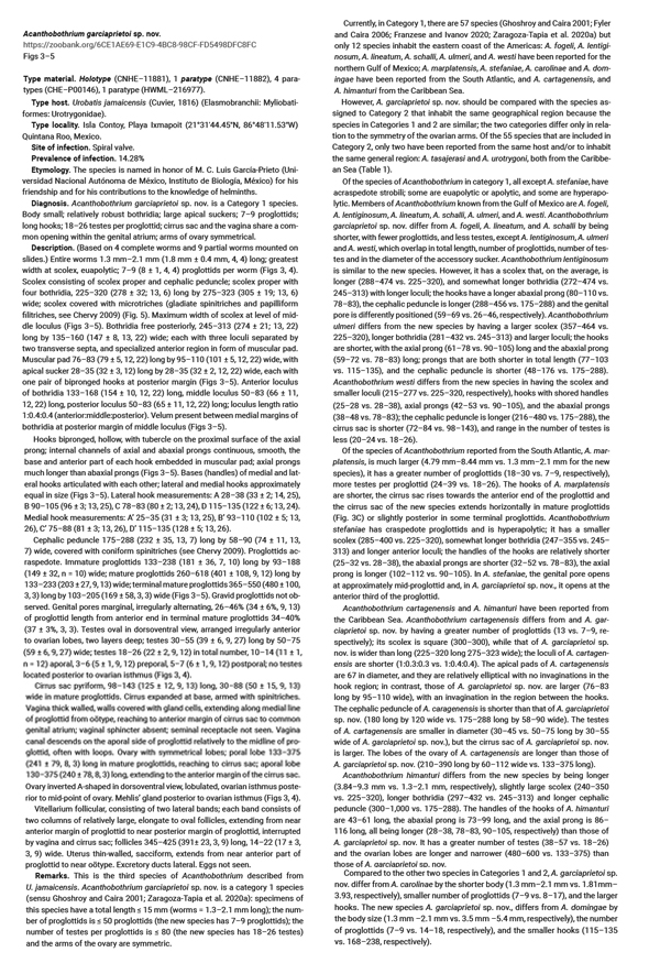 Rodriguez-Ibarra, E., J. Violante-Gonzalez, and S. Monks. 2023. Two new species of Acanthobothrium Blanchard, 1848 (Cestoda, Onchoproteocephalidea) from Urobatis jamaicensis (Cuvier, 1816) (Elasmobranchii, Batoidea, Myliobatiformes) of the Mexican Caribbean. ZooKeys 1169: 175—201. (7545) Download PDF |