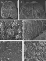 Figure 5. Acanthobothrium garciaprietoi sp. nov. SEM images. Paratype (not deposited) A scolex B bothridial muscular pad with pair of hooks C central area of scolex proper between the bothridia D gladiate spinitriches located on the proximal bothridial surface, see image C E papilliform filitriches located on the scolex proper, behind the bothridia, see image C F coniforme spinitriches located on the cephalic peduncle. Scale bars: 5 μm (D–F); 30 μm (C); 100 μm (A, B).