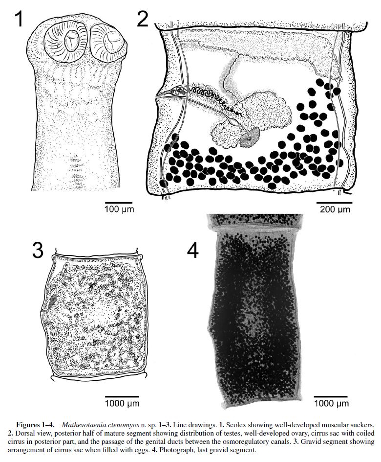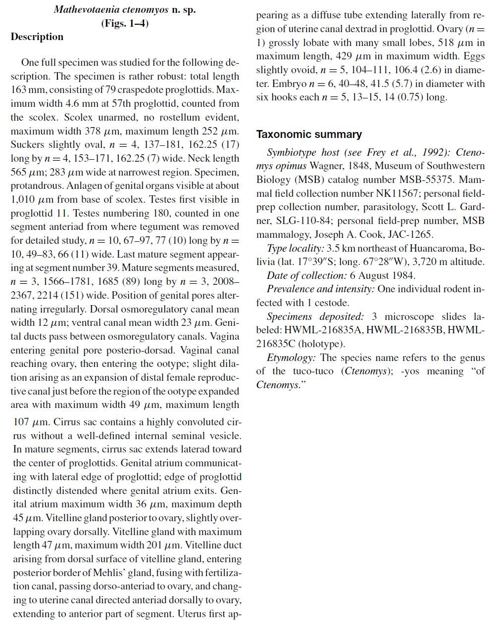 Gardner, S. L., B. A. Grappone, and A. Lai. 2023. A new species of Mathevotaenia (Cestoda: Anoplocephalidae) from the Andean Tuco-Tuco, Ctenomys opimus (Rodentia: Ctenomyidae), on the Altiplano of Bolivia. Comparative Parasitology 90: 34-38. (7557) |