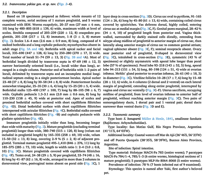 Type Material Holotype MACN-Pa 783 (entire worm); 7 paratypes MACN-Pa 784/1–4, 785/1–3 (6 entire worms, histological sections of 1 mature proglottid); 5 paratypes MLP-He 8064–8068 (5 entire worms)