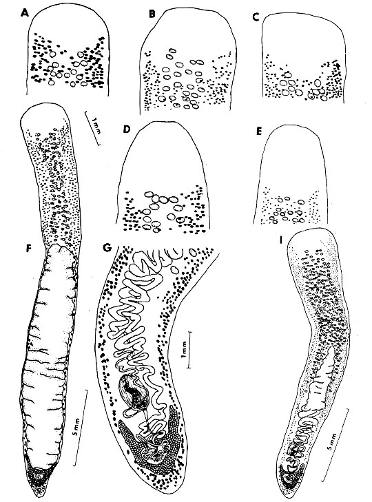 Fig. 1. Caryophyllaeides ergensi sp. n. (A - E - anterior part of body, F, I--total view, G-- posterior part of body) (I-- holotype)