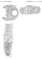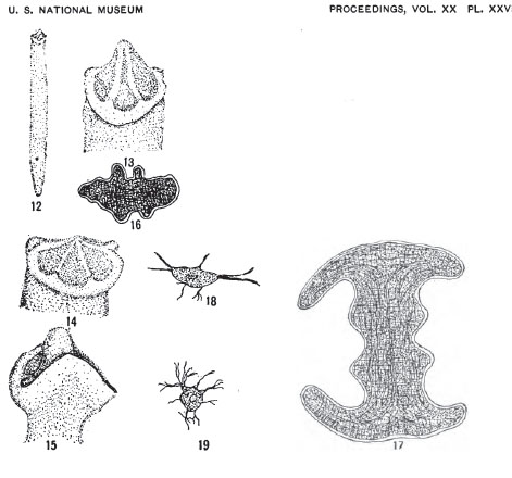 Plate XXVII Fig. 12. Ventral view of specimen. Enlarged three times. Fig. 13. Head of same, side view. Enlarged fifteen times. Fig. 14. Head of another specimen, side view. Enlarged fifteen times. Fig. 15. Marginal view of head. Enlarged fifteen times. Fig. 16. Transverse section near anterior end of head. Zeiss 2/A, draw-tube open. Fig. 17. Transverse section of head farther back than fig. 16. Zeiss 2/A, draw-tube open. Fig. 18. Cell from parenchyma (see Plate XXVIII, Fig. 2). Zeiss 4/D, draw-tube open. Fig. 19. Another cell from same. Zeiss 2/D, draw-tube open.
