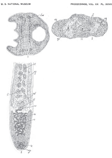 Plate XXVIII Fig. 1. Transverse section toward base of head. Zeiss 2/A, draw-tube open. Fig. 2. Transverse section through middle of body, ge. cell in parenchynea, see Plate XXVII, Figs. 18 and 19. Zeiss 2/A, draw-tube open. Fig. 3. Diagrammatic sketch, ventral view.