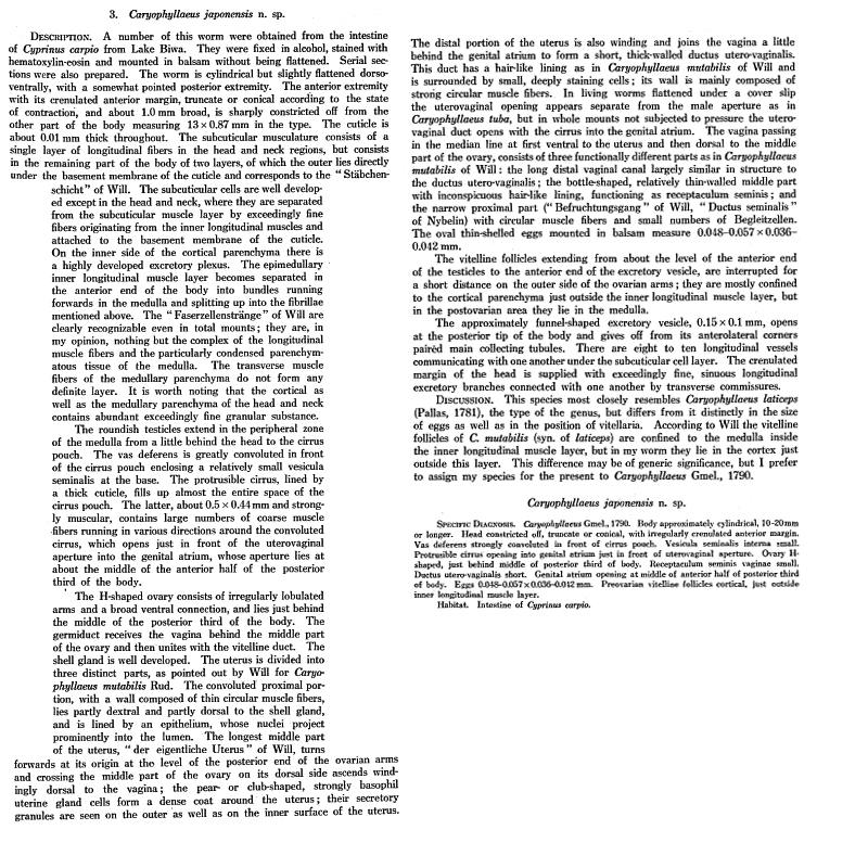 Yamaguti, S. 1934. Studies on the helminth fauna of Japan. Part 4. Cestodes of fishes. Japanese Journal of Zoology 6: 1-112.