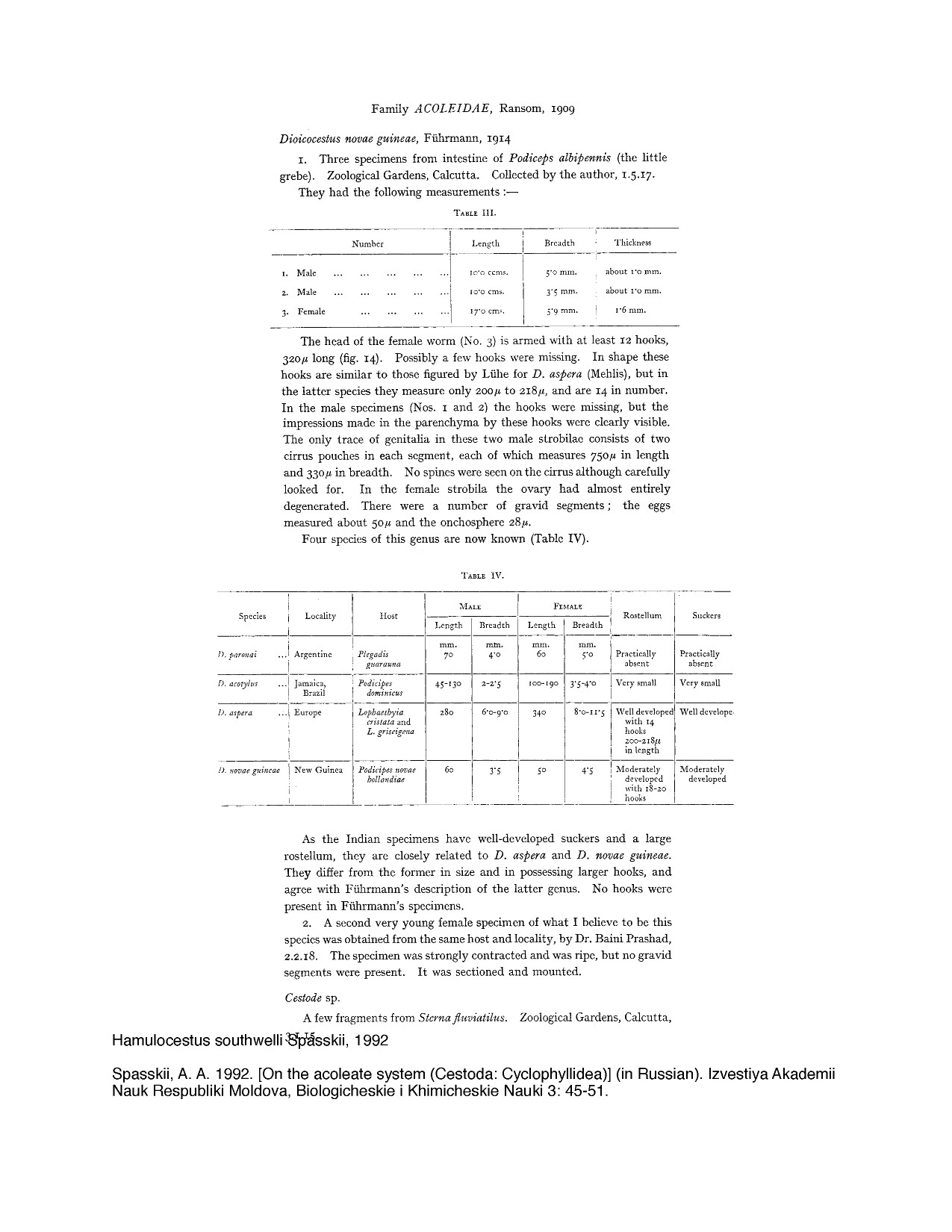 | Scientific Name Notes | -Spasskii (1992) erected this species for Dioicocestus novaeguinea of Southwell, 1922 identified in error as D. novaeguinea Fuhrmann, 1914 -The description and illustrations come from Southwell (1922) |