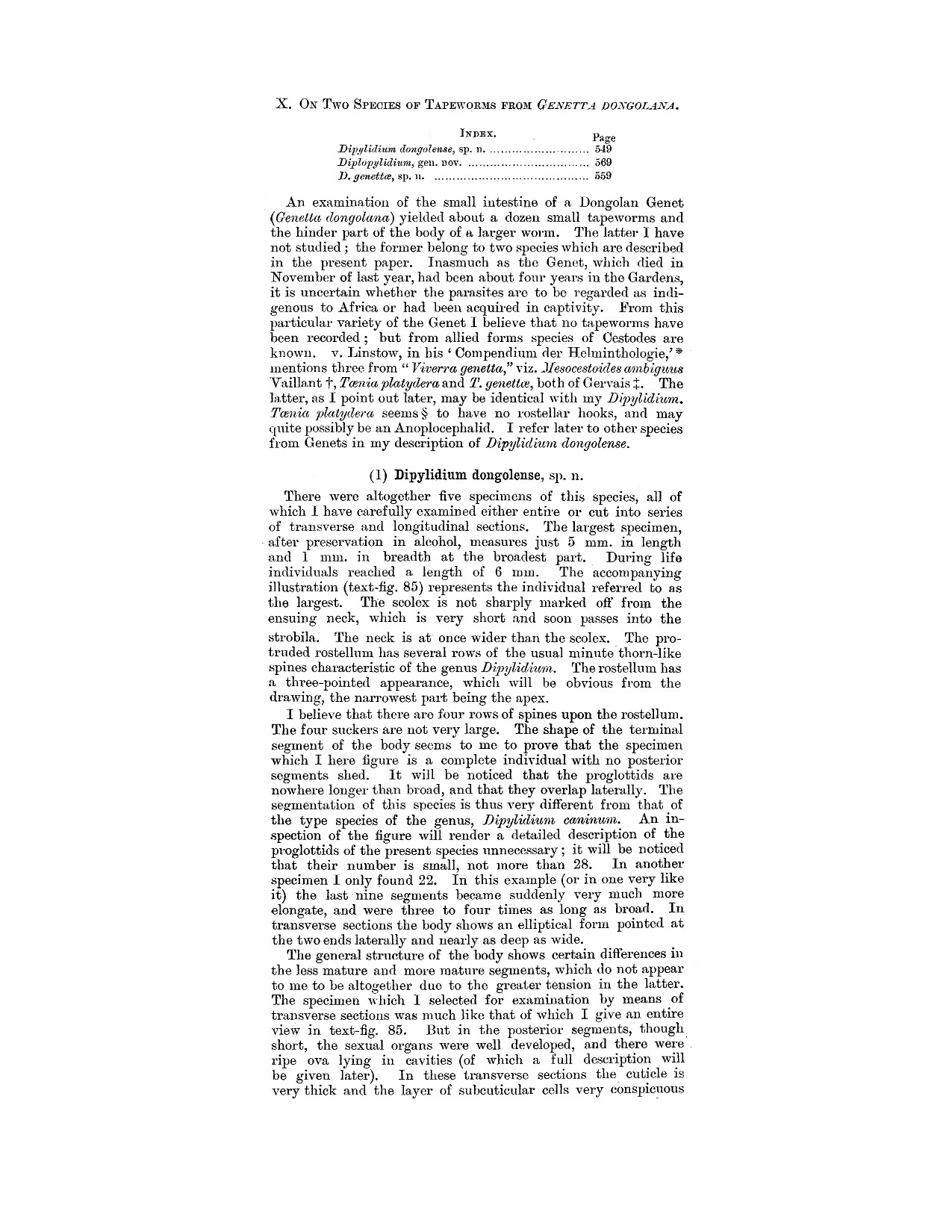 Beddard, F. E. 1913. Contributions to the Anatomy and Systematic Arrangement of the Cestoidea. X. On two new species of tapeworms from Genetta dongolana. Proceedings of the Zoological Society of London 1913(2): 549-571. (6166) Download PDF |