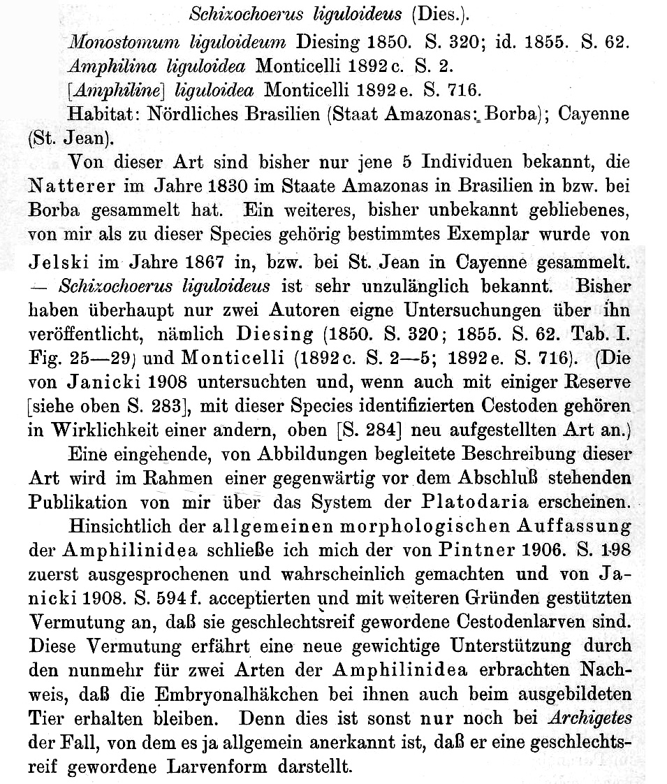 | Scientific Name Notes | - Diesing's original description of Monostoma liguloidea appears to be based on a mixed collection of Schizochoerus liguloideus and Nesolecithus janickii; -page 320 |