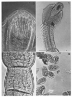 FIGURES 1-4. Echinobothrium herfordi n. sp. 1. Head, showing scolex and armed peduncle. 2. One group of apical hooks. 3. Central region of a strobila showing the six testes. 4. Eggs, showing the short terminal reflexed process.