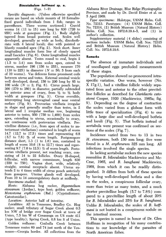 Mackiewicz, J. S. 1972. Two new species of caryophyllid tapeworms from catostomid fishes in Tennessee. Journal of Parasitology 58(6): 1075-1081. (690) Download PDF |