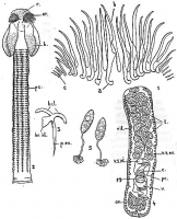 FIGURES 2-5. 2. Scolex. 3. Epine isolee du pedoncule cephalique. 4. Preparation totale d’un anneau sexue. 5. Oeufs.