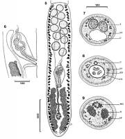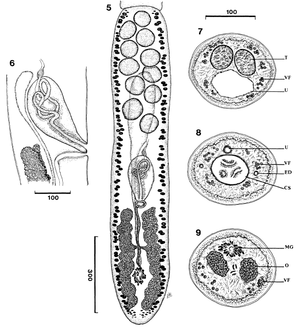 5. Mature segment, ventral view. 6. Detail of terminal genitalia, lateral view. 7. Mature proglottid in transverse section at level of testes. 8. At level of cirrus sac. 9. At level of ovary. Abbreviations: CS, cirrus sac; ED, excretory duct; MG, Mehlis’ gland; O, ovary; T, testis; U, uterus; VF, vitelline follicle.