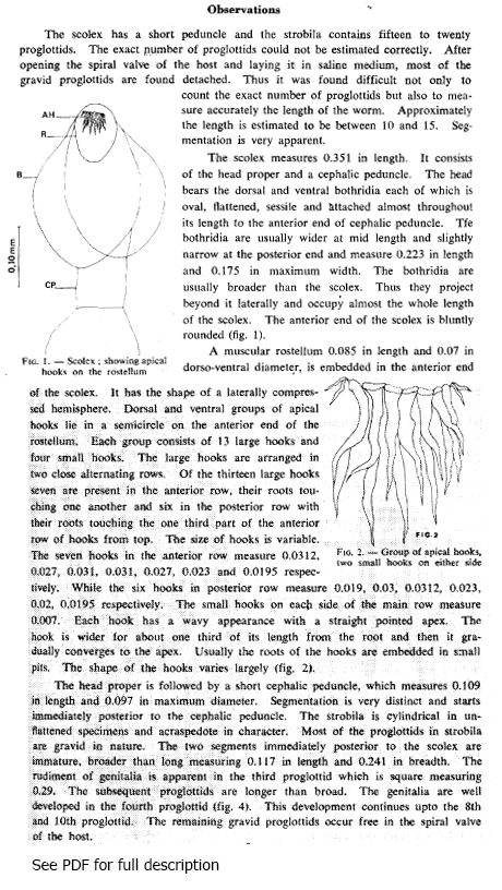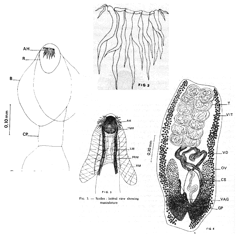 FIGURES 1-4. Echinobothrium reesae n. sp. 1. Scolex, whowing apical hooks on the rostellum. 2. Group of apical hooks, two small hooks on either side. 3. Scolex, lateral view showing musculature. 4. ... MoreFIGURES 1-4. Echinobothrium reesae n. sp. 1. Scolex, whowing apical hooks on the rostellum. 2. Group of apical hooks, two small hooks on either side. 3. Scolex, lateral view showing musculature. 4. Mature proglottid, ventral view showing reproductive system. |