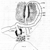 Fig. 5. — The female reprductive complex Key to the Figures. — A.H.: Apical hooks, B: Bothridium, Cp: Cephalic peduncle; CS: Cirrus sac, F.C.: Fertilization Canal, G.P.: Genital pore, L.M.: Longitudin... MoreFig. 5. — The female reprductive complex Key to the Figures. — A.H.: Apical hooks, B: Bothridium, Cp: Cephalic peduncle; CS: Cirrus sac, F.C.: Fertilization Canal, G.P.: Genital pore, L.M.: Longitudinal muscles, MG: Mehlis' gland, OC: Oocapt, OCY: Oocyte, OOT: Ootype, OV: Ovary, OVD: Oviduct, PRM: Protractor muscles, R: Rotellum, RM: Radial muscles, T: Testes, TMR: Transverse muscles of rostellum, UT: Uterus, VAG: Vagina, VD: Vas deferens, VIT: Vitellaria, VIT. D: Vitelline duct |