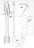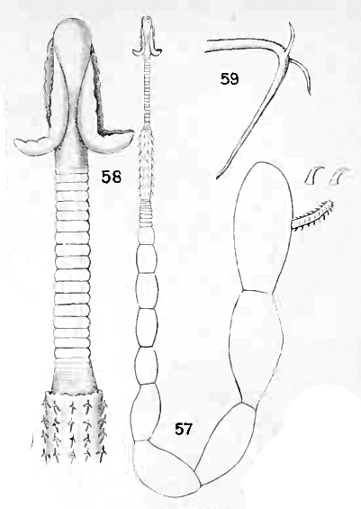 FIGURES 57-59. Echinobothrium rhinoptera n. sp. 57. Whole worm, magnified. 58. Head of the same, more highly magnified. 59. Spine from the spinous region, very highly magnified.