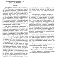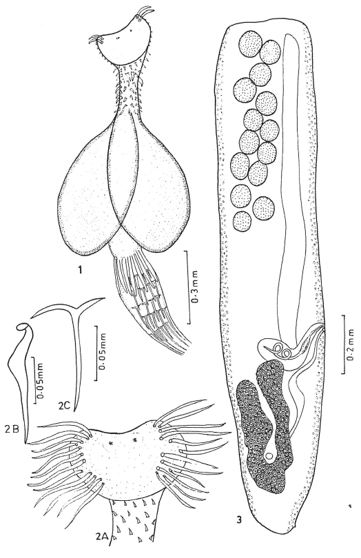 FIGURES 1-3. Echinobothrium scoliodoni n sp. 1. Scolex. 2. a) Schematic representation of hooks b) Apical hook enlarged c) Cephalic hook enlarged. 3. Mature proglottid (short neck form).