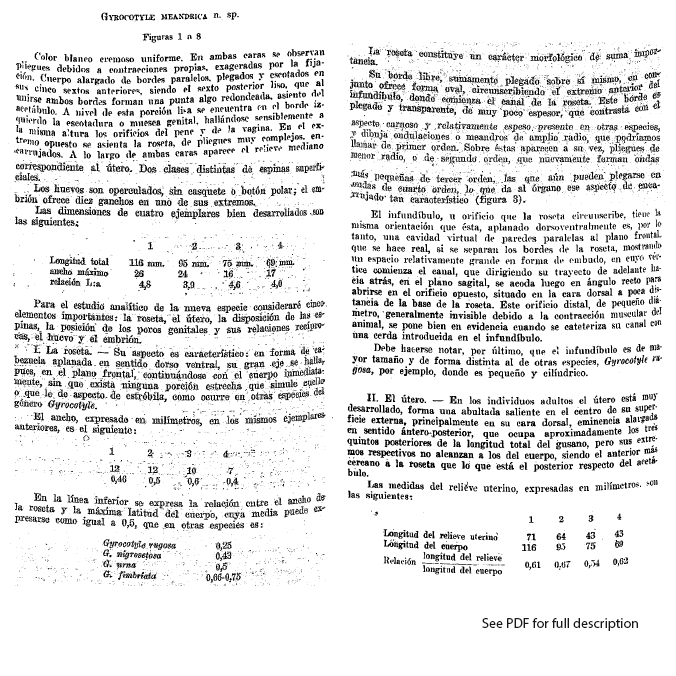Mendīvil-Herrera, J. 1946. Gyrocotyle meandrica n. sp. del intestino espiral del pez gallo, Callorhynchus callorhynchus (L.). Comunicaciones Zoológicas del Museo de Historia Natural de Montevideo 2(36): 1-12. (6777) Download PDF |